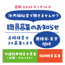 >池内わらべ保育園 >かわらまち夜間保育園>かわらまち保育園 >げんきっこクラブ学童保育所 >くまのまえ保育園 >まつかぜ保育園 >つながるひろば 恵方の家 >ありんこ作業所 >ショートステイありんこ >ありんこホーム >ひだまりの里 >施設一覧 >池内福祉会の概要 >池内福祉会の理念 >池内福祉会のあゆみ >池内福祉会の実践 >池内福祉会を発展させる会 ,ikeuchihukushi,sample04,{"version":2,"widgetId":"f039f828-097f-4b73-a895-2b73af04dfa7","type":"profile","width":"100","height":"300","interval":6000,"rpp":"4","theme":{"shell":{"background":"d8e9f2","color":"333333"},"tweets":{"background":"ffffff","color":"333333","links":"4fc0f9"}},"features":{"avatars":false,"hashtags":true,"timestamp":true,"scrollbar":false,"live":false,"loop":false,"behavior":"all"},"wUnit":"%","hUnit":"px","oem":"0"} >プライバシーポリシー >お問い合わせ >池内福祉会 役員名簿 >池内福祉会 役員報酬及び費用弁償規定 >池内福祉会 定款