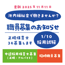 >池内わらべ保育園 >かわらまち夜間保育園>かわらまち保育園 >げんきっこクラブ学童保育所 >くまのまえ保育園 >まつかぜ保育園 >つながるひろば 恵方の家 >ありんこ作業所 >ショートステイありんこ >ありんこホーム >ひだまりの里 >施設一覧 >池内福祉会の概要 >池内福祉会の理念 >池内福祉会のあゆみ >池内福祉会の実践 >池内福祉会を発展させる会 ,ikeuchihukushi,sample04,{"version":2,"widgetId":"f039f828-097f-4b73-a895-2b73af04dfa7","type":"profile","width":"100","height":"300","interval":6000,"rpp":"4","theme":{"shell":{"background":"d8e9f2","color":"333333"},"tweets":{"background":"ffffff","color":"333333","links":"4fc0f9"}},"features":{"avatars":false,"hashtags":true,"timestamp":true,"scrollbar":false,"live":false,"loop":false,"behavior":"all"},"wUnit":"%","hUnit":"px","oem":"0"} >プライバシーポリシー >お問い合わせ >池内福祉会 役員名簿 >池内福祉会 役員報酬及び費用弁償規定 >池内福祉会 定款