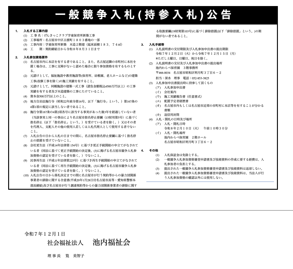 社会福祉法人 池内福祉会 げんきっこクラブ学童保育所 新築工事 1. 入札する工事内容 (1) 工事名:げんきっこクラブ学童保育所新築工事 (2) 工事場所:名古屋市中区古渡町1803番地の一部 (3) 工事内容:学童保育所新築 木造2階建(延床面積183.74㎡) (4) 工 期:契約締結日から令和8年8月31日まで 2. 入札参加資格要件 (1) 名古屋市内に本店を有する者であること。また、名古屋近隣の市町村に本社を置く場合は、工事に支障がないと認めた場合に限り参加資格を有するものとする。 (2) 元請けとして、福祉施設や教育施設等(保育所、幼稚園、老人ホームなど)の建築工事(改修工事を除く)の施工実績を有すること。 (3) 元請けとして、同種施設の建築一式工事(請負金額税込4500万円以上)の工事実績を有する者及び木造建築の工事にたけていること。 (4) 資本金500万円以上のこと。 (5) 地方自治法施行令(昭和22年政令第16号。以下「施行令」という。)第167条の4第1項の規定に該当しない者であること。 (6) 施行令第167条の4第2項各号に該当する事実があった後3年を経過していない者(当該事実と同一の事由により名古屋市指名停止要綱(15財用第5号)に基づく指名停止(以下「指名停止」という。)を受けている者を除く。)又はその者を代理人、支配人その他の使用人若しくは入札代理人として使用する者でないこと。 (7) 入札公告の日から入札の日までの間に、名古屋市指名停止要綱に基づく指名停止の措置を受けていないこと。 (8) 会社更生法(平成14年法律第 154号)に基づき更正手続開始の申立てがなされている者(同法に基づく更正手続開始の決定後、(3)に掲げる名古屋市競争入札参加資格の認定を受けている者を除く。)でないこと。 (9) 民事再生法(平成11年法律第225号)に基づき再生手続開始の申立てがなされている者(同法に基づく再生手続開始の決定後、(3)に掲げる名古屋市競争入札参加資格の認定を受けている者を除く。)でないこと。 (10) 入札公告の日から落札決定までの間に名古屋市が行う契約等からの暴力団関係事業者の排除に関する合意書(平成20年1月28日付名古屋市長等・愛知県警察本部長締結)及び名古屋市が行う調達契約等からの暴力団関係事業者の排除に関する取扱要綱(19財契第103号)に基づく排除措置(以下「排除措置」という。)の期間がない者であること。 3. 入札手続等 (1) 入札説明書の交付期限及び入札参加申出書の提出期限 令和7年12月2日(火)から令和7年12月15日(月) ※ただし土曜日、日曜日、祝日を除く。 (2) 入札説明書の交付及び入札参加申出書の提出場所 池内わらべ保育園 3階事務所 〒466-0034 名古屋市昭和区明月町3丁目6-2 担当:深水 理事 電話:052-853-3825 (3) 入札参加申出書提出時に持参して頂くもの (1) 入札参加申出書 (2) 会社案内 (3) 施工実績報告書(任意書式) (4) 配置予定者経歴書 (5) 名古屋市内もしくは名古屋市近郊の市町村に本店等を有することが分かる書類 (6) 返信用封筒 (4) 入札・開札の日時及び場所 (1) 入札・開札日時 令和8年2月10日(火) 午前10時30分 (2) 入札・開札場所 池内わらべ保育園 2階ホール 名古屋市昭和区明月町3丁目6-2 4. その他 (1) 入札保証金は免除とする。 (2) 一般競争入札参加資格審査申請書及び技術資料の作成に要する経費は、入札参加者の負担とする。 (3) 提出された一般競争入札参加資格審査申請書及び技術資料は返却しない。 (4) 提出された一般競争入札参加資格審査申請書及び技術資料は、当法人が行う入札参加資格の確認以外には使用しない。