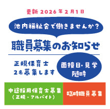 >池内わらべ保育園 >かわらまち夜間保育園>かわらまち保育園 >げんきっこクラブ学童保育所 >くまのまえ保育園 >まつかぜ保育園 >つながるひろば 恵方の家 >ありんこ作業所 >ショートステイありんこ >ありんこホーム >ひだまりの里 >施設一覧 >池内福祉会の概要 >池内福祉会の理念 >池内福祉会のあゆみ >池内福祉会の実践 >池内福祉会を発展させる会 ,ikeuchihukushi,sample04,{"version":2,"widgetId":"f039f828-097f-4b73-a895-2b73af04dfa7","type":"profile","width":"100","height":"300","interval":6000,"rpp":"4","theme":{"shell":{"background":"d8e9f2","color":"333333"},"tweets":{"background":"ffffff","color":"333333","links":"4fc0f9"}},"features":{"avatars":false,"hashtags":true,"timestamp":true,"scrollbar":false,"live":false,"loop":false,"behavior":"all"},"wUnit":"%","hUnit":"px","oem":"0"} >プライバシーポリシー >お問い合わせ >池内福祉会 役員名簿 >池内福祉会 役員報酬及び費用弁償規定 >池内福祉会 定款